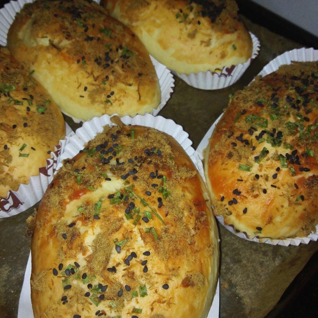 肚里肉松沙拉馅,表面涂了番茄酱,加上肉松香葱芝麻,又软又香