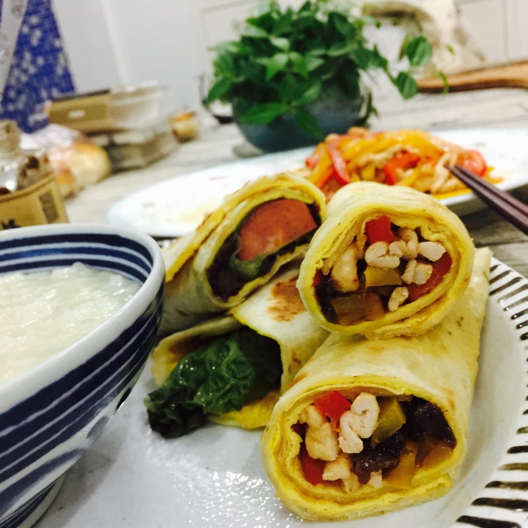 彩椒鸡丝卷饼+混合小米粥