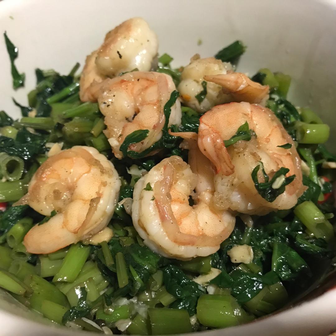 虾炒空心菜 放了小米辣和鱼露 简直可以和我爸做的媲美