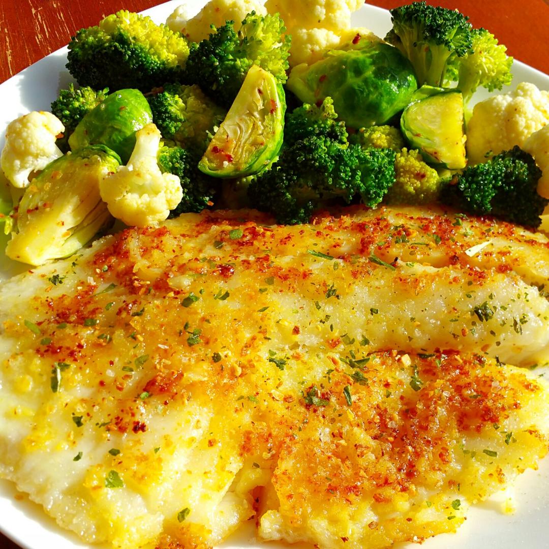 #午餐•2016年11月9日#饼星人的午餐,饼星人的午餐,饼星人的午餐。蒜香黄油煎tilapia,没有裹面包屑,就只裹了薄薄的淀粉,用European style butter煎香蒜末再下锅煎到两面金黄撒上烤干的罗勒碎,现磨干柠檬皮和海盐,剩下的黄油和蒜末sauté了蔬菜。鱼肉香嫩又多汁,饼星人每吃一口都发出销魂的叫声😅我开瓶酒的工夫,一转眼他半条鱼半碗饭已经没了😲幸亏我给自己也做了一条不同做法的,不然还真抢不过他😅