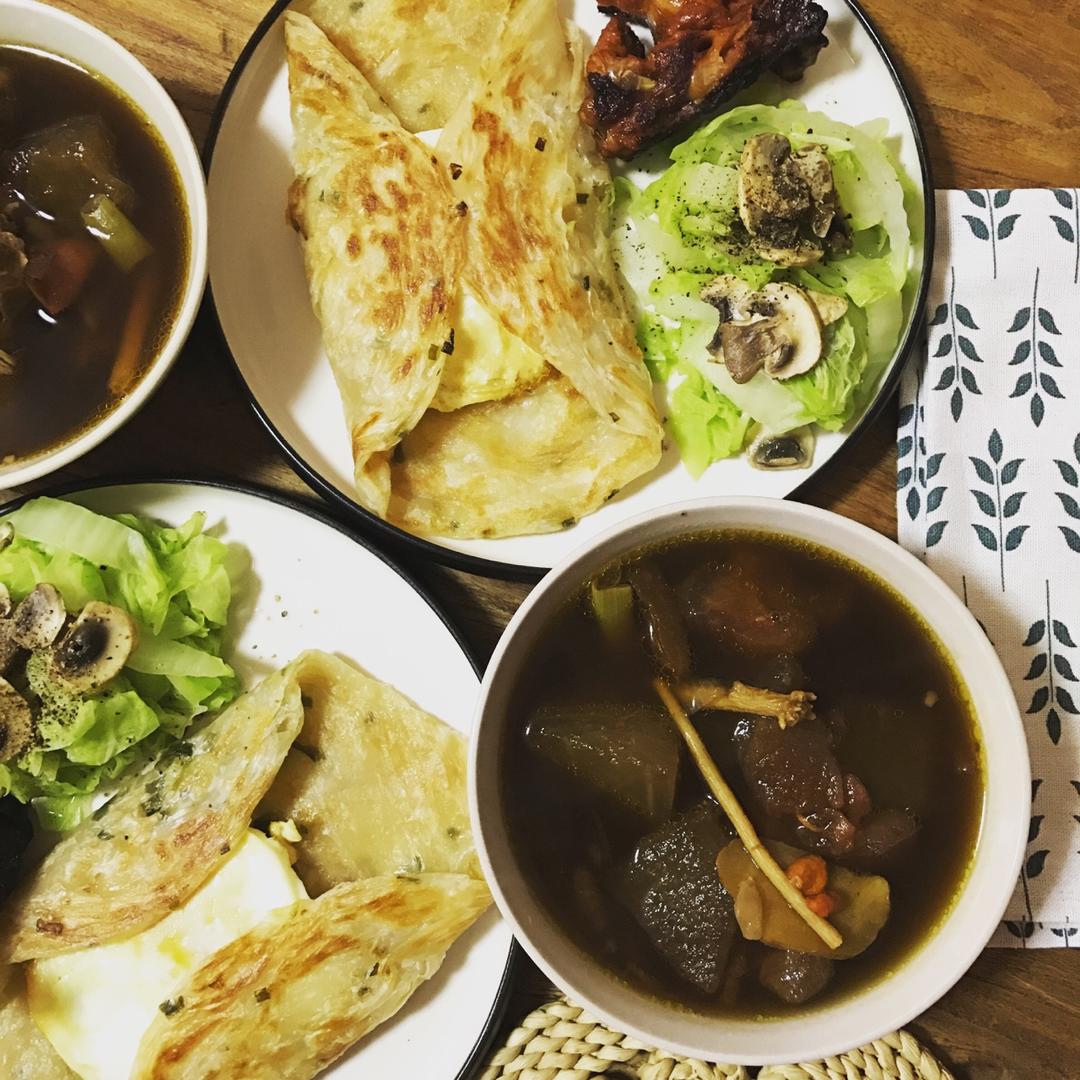 气血排骨汤+葱油饼夹蛋+过水菜+鸡翅