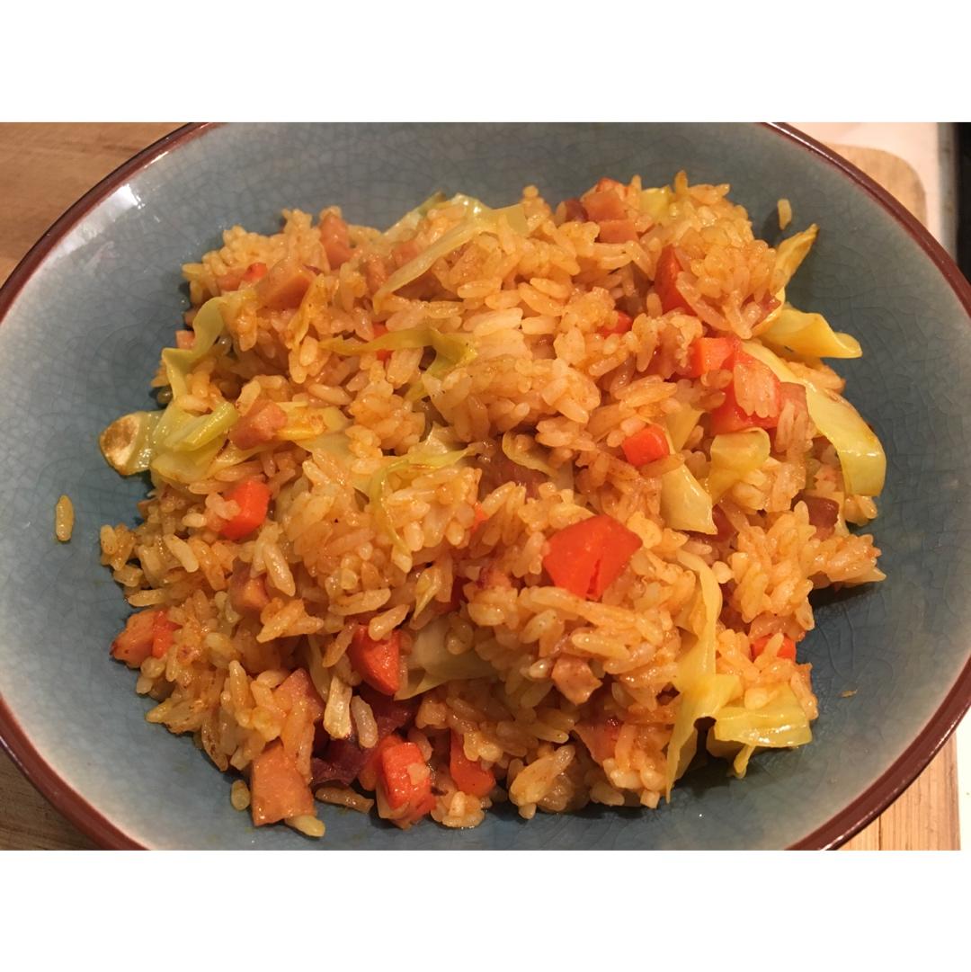 火腿,午餐肉,白菜,胡萝卜。咖喱炒饭真的好香……一大碗吃完😋😋😋😋