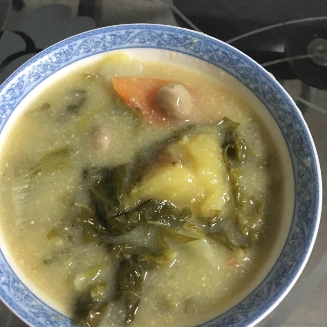 老婆婆晚上煮的菜粥(鸡汤、菜,胡萝卜,山芋、花生米),再来一盘小鱼炒萝卜干,绝配!