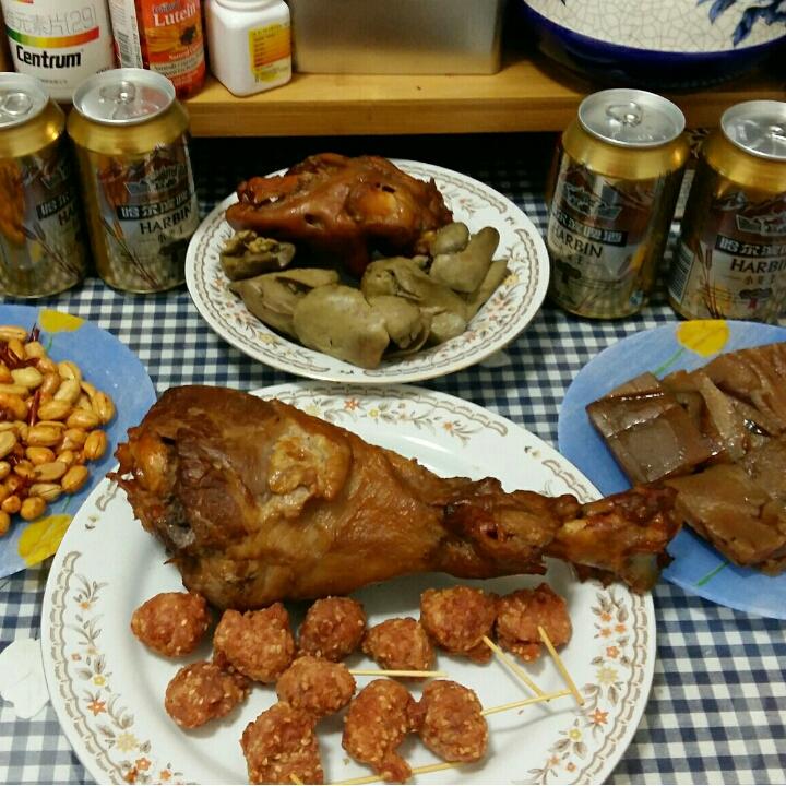 山水百合 做过 晚餐•2016年12月22日 #晚餐•2016年12月22日#今日晚餐基本准备好了!火鸡腿,猪手,棒肉,鸡肝,香辣花生米,五香肉皮(都是在一手店买的),还有某人爱喝的哈啤,再焖一锅米饭,做个牡蛎汤就齐活儿了! 2016-12-22