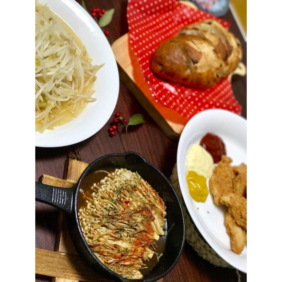 烤金针菇,炸鸡,醋溜豆芽,法棍