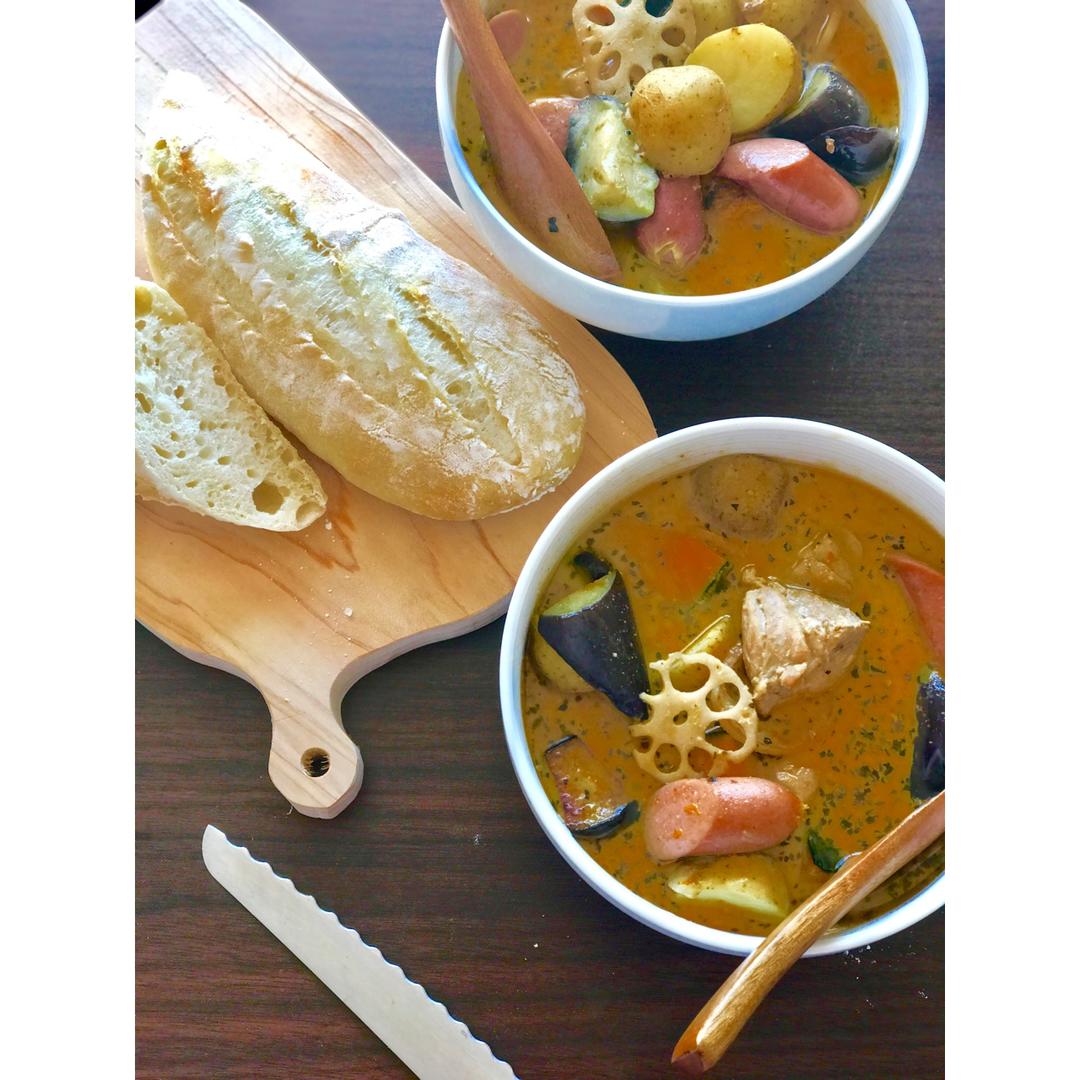 Mora濛濛 做过 午餐•2017年1月7日 中午吃法棍和汤咖喱。吃面包上瘾,烤起来也上瘾,想完美地成功一次,就忍不住反复尝试。反正最近老公还没吃腻,能帮我消耗。 #午餐•2017年1月7日##Mora・薄午# 2017-01-07