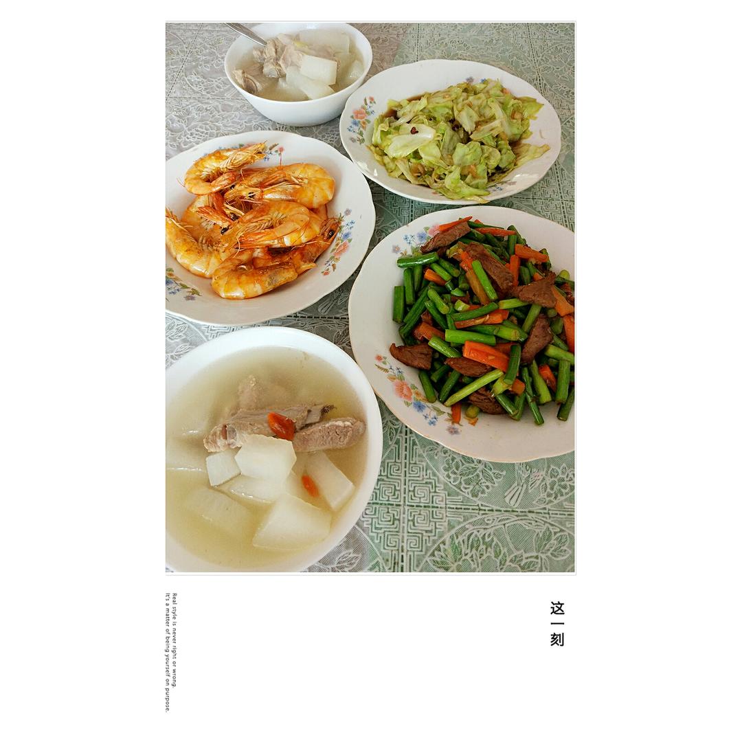 排骨白萝卜枸杞汤~牛肉蒜薹~爆炒青虾~呛甘蓝😘