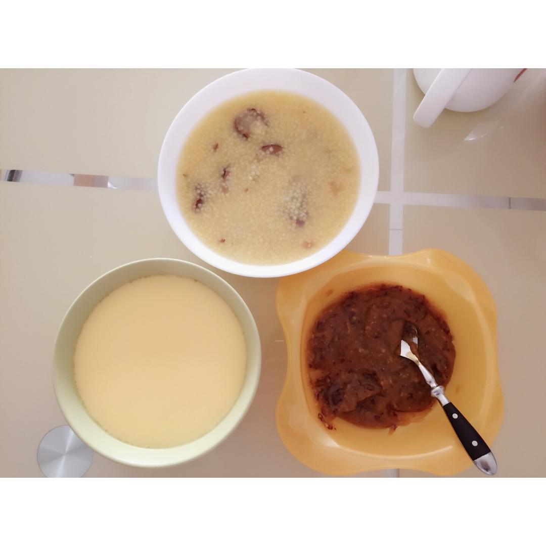 红枣小米泥,蒸鸡蛋。一口甜一口咸,宝宝终于赏脸吃了点😄