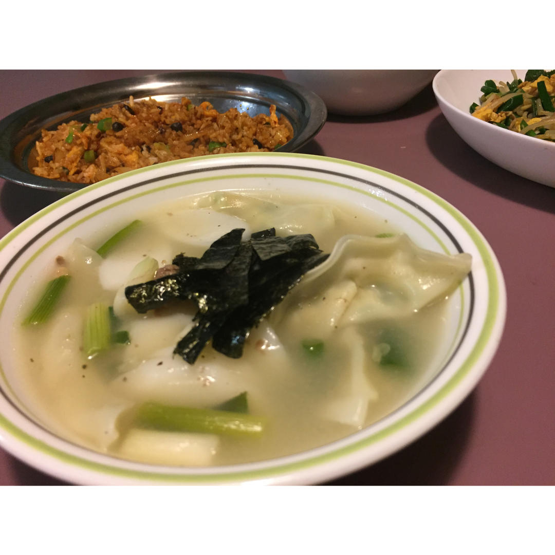 镜子练练吃吃吃 做过 不是我做过的是我吃过的!! Sky做的新年汤~ 她说每个新年韩国每家每户都会喝 喝了就证明长大一岁啦!因为我还剩了点汤里的年糕没喝完 然后她就说 你快明天吃掉!不然你少长了1/4岁!哈哈 #晚餐•2017年1月29日# 2017-01-30