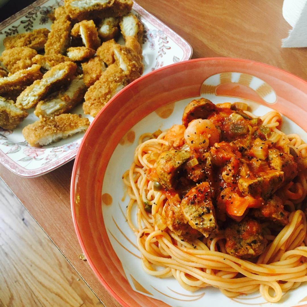 虾仁肉丸意面+炸鸡胸肉.