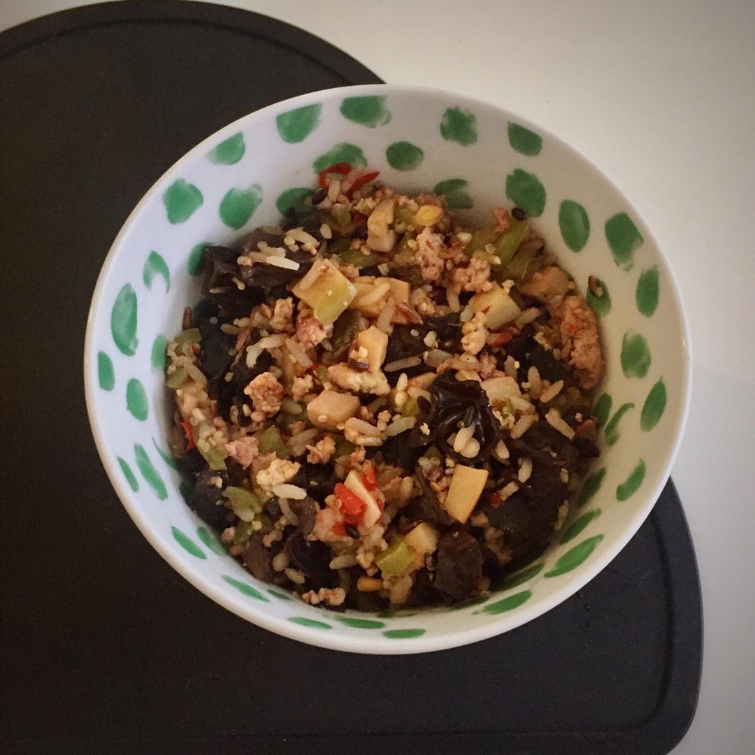火鸡糜五谷米炊饭(火鸡糜120g、木耳100g、杏鲍菇100g、青椒100g、五谷米70g,剁椒一勺、生抽1勺)