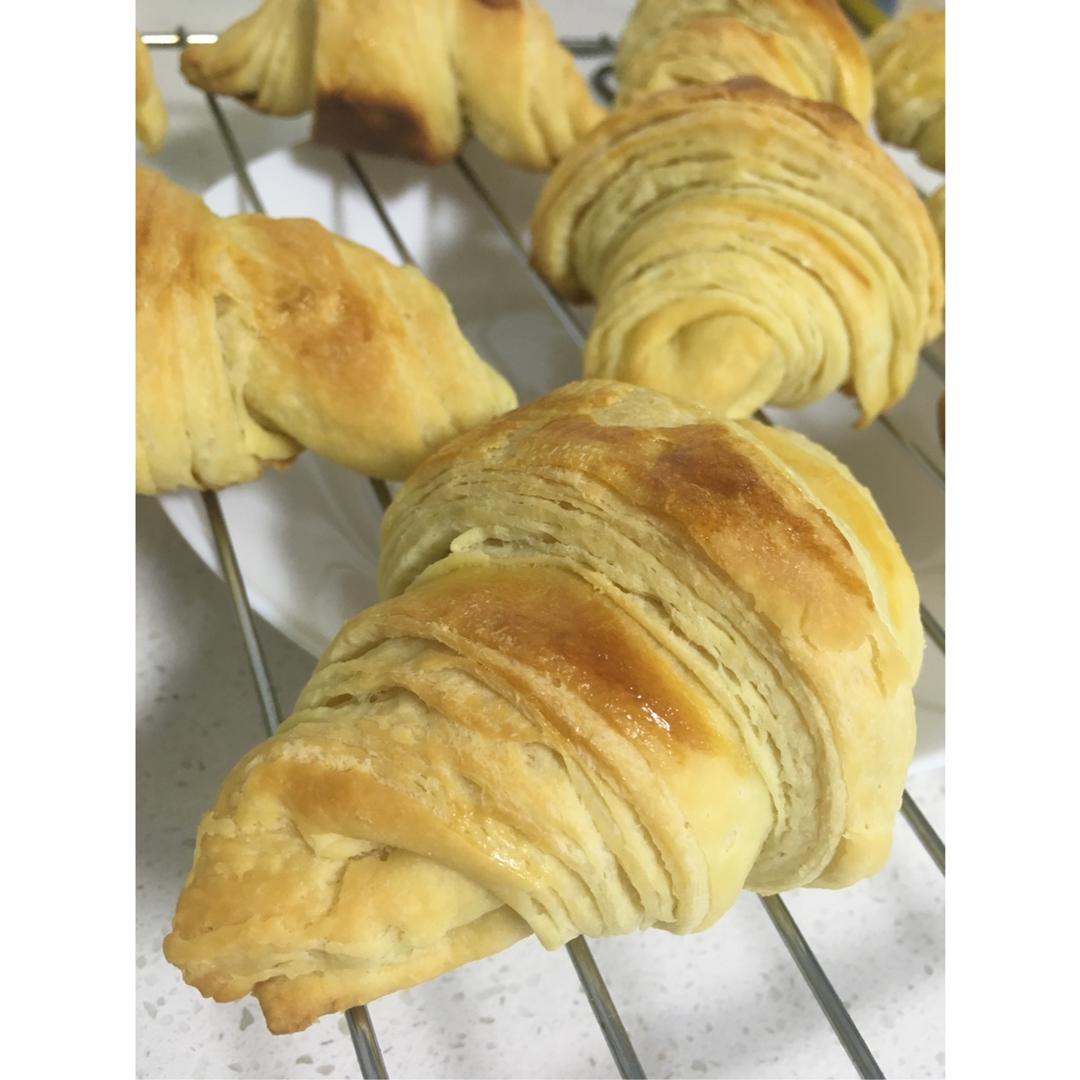 亖丫头亖 做过 第二次可颂记录 也是第二次,面好硬根本出不来膜😭,包的奶油也跑出来了,最后一步怎么也擀不开那么薄,是擀面杖的问题呢?还是擀面杖的问题呢?刷了蛋液好像好看一些。烤箱温度有问题吧,下面已经焦了上面还一点色都没有,关了下管上管190度又烤了十分钟,里面基本涨开了。虽然没有美丽的组织,口感好像油酥馍😏,但是我和🐶大半夜的分了一个 2017-02-18