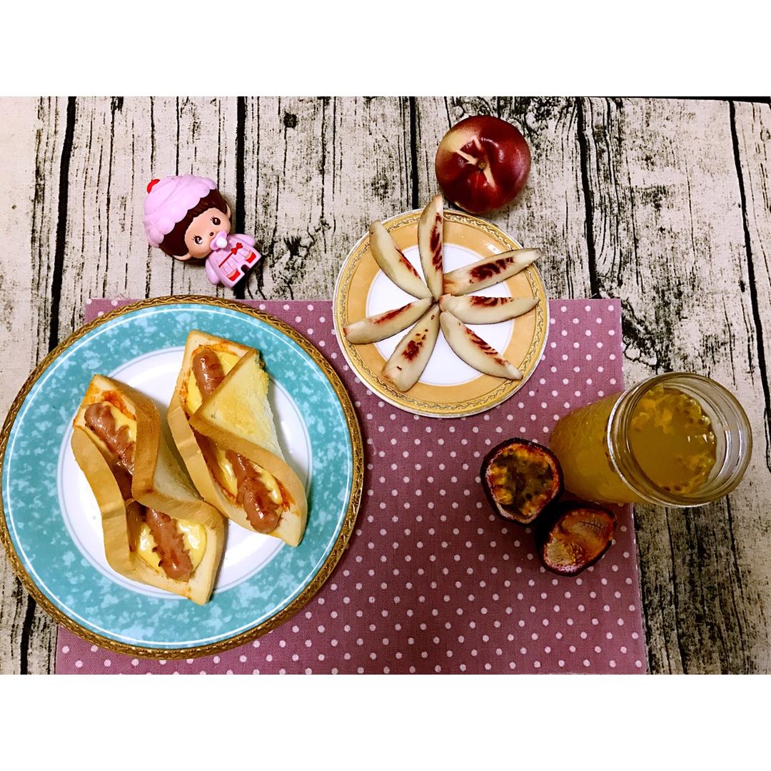 热狗芝士三文治➕百香果蜂蜜水➕桃子