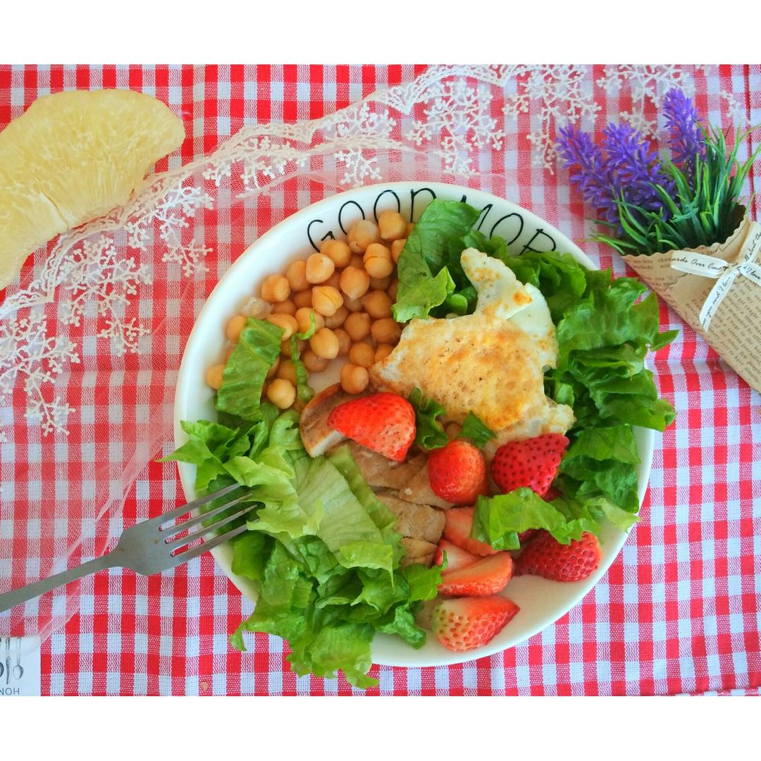 减脂啦 早晨 鸡胸肉草莓生菜鸡蛋鹰嘴豆柚子豆浆✌