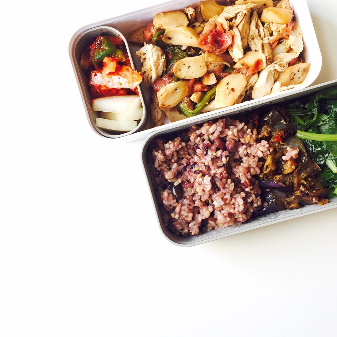 周一便当:梅子鸡胸 豆豉炒茄子 烫菠菜 杂粮饭