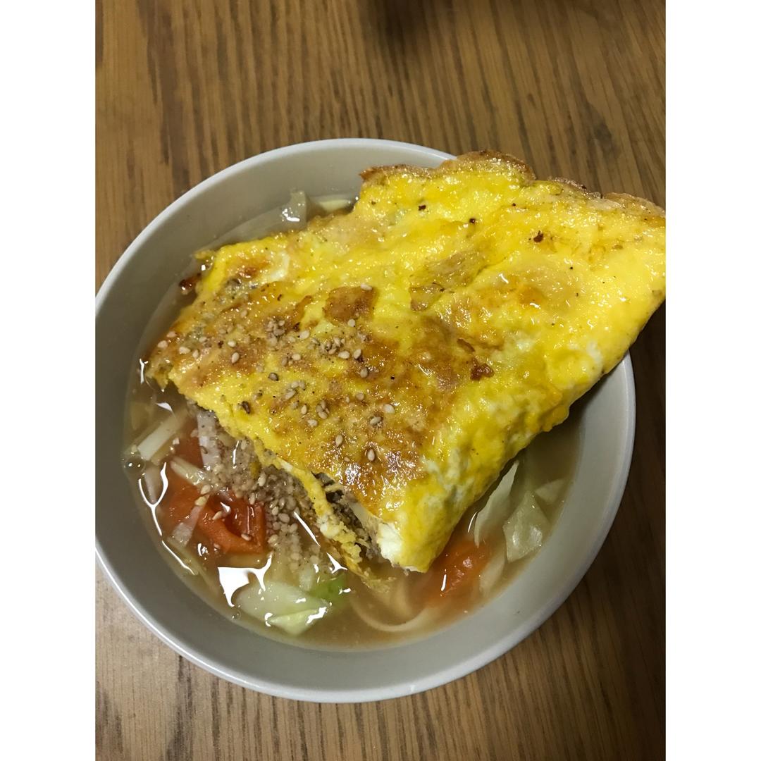 今天的蛋包肉做了点改良,加了马蹄丁和肉末一起,配番茄面,撒上点芝麻,完美