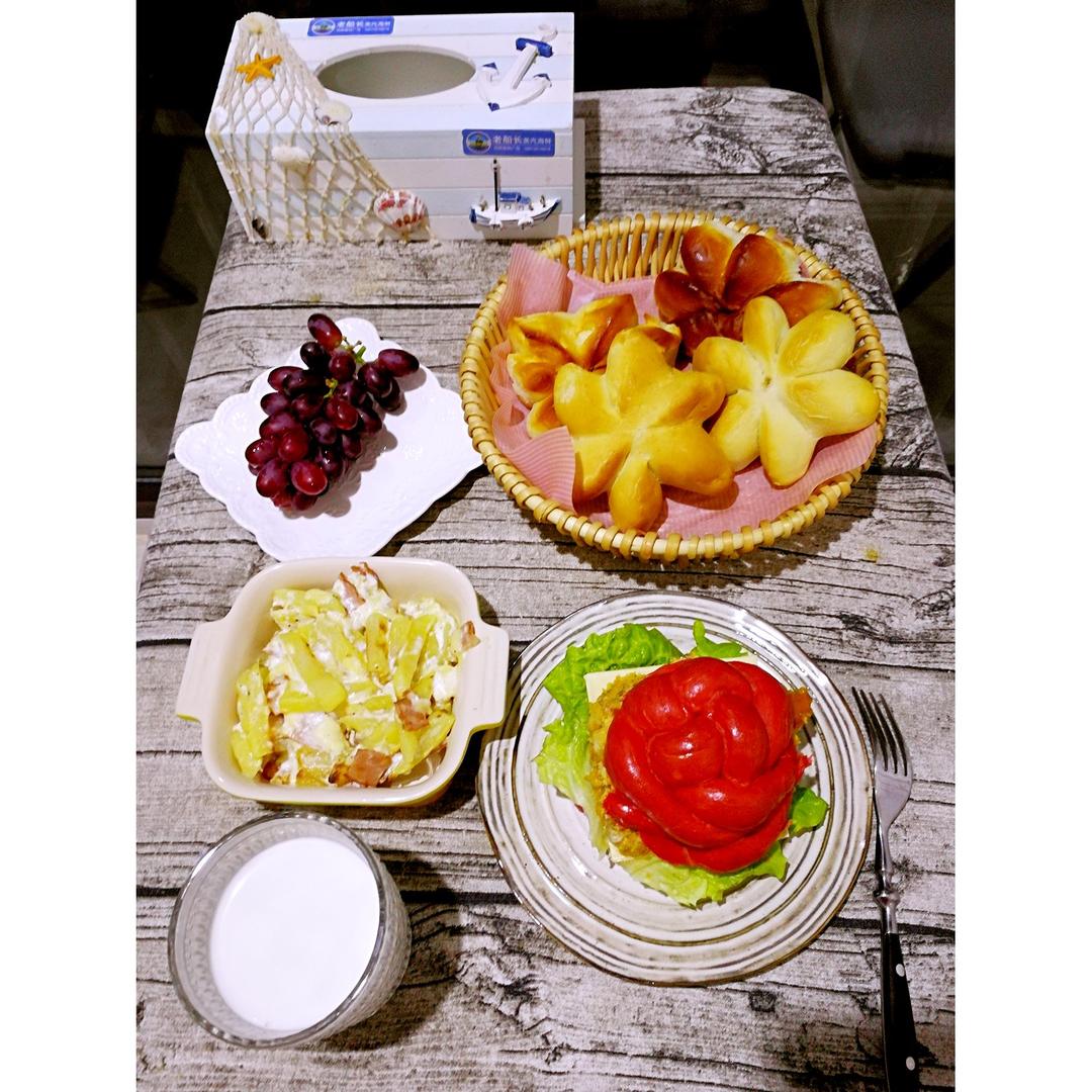 亲们早上好🌹绣球猪排汉堡、奶酪培根焗土豆、京江脐、热牛奶、红提😊😊😊