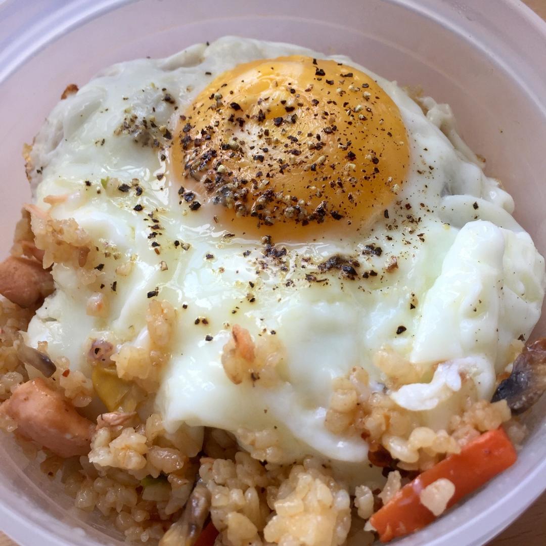 三文鱼蘑菇胡萝卜青豆炒饭+荷包蛋