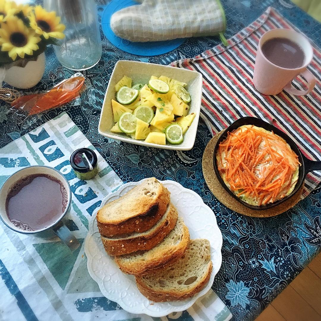 紫薯豆浆,全麦面包配抹茶酱,青柠薄荷菠萝,胡萝卜煎蛋。