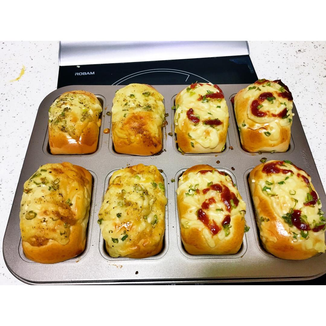 香葱芝士面包,两种口味,香葱芝士肉松包.香葱芝士烤肠包儿子对咸口面包的喜爱不是甜口面包可比滴😋😋!