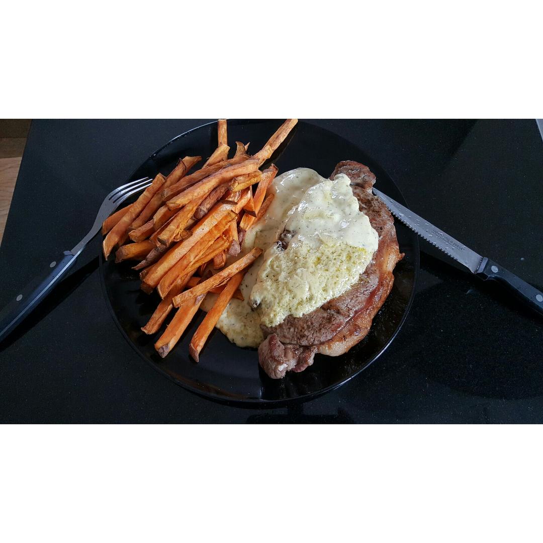 14 oz sirloin steak with sweet potatoes.