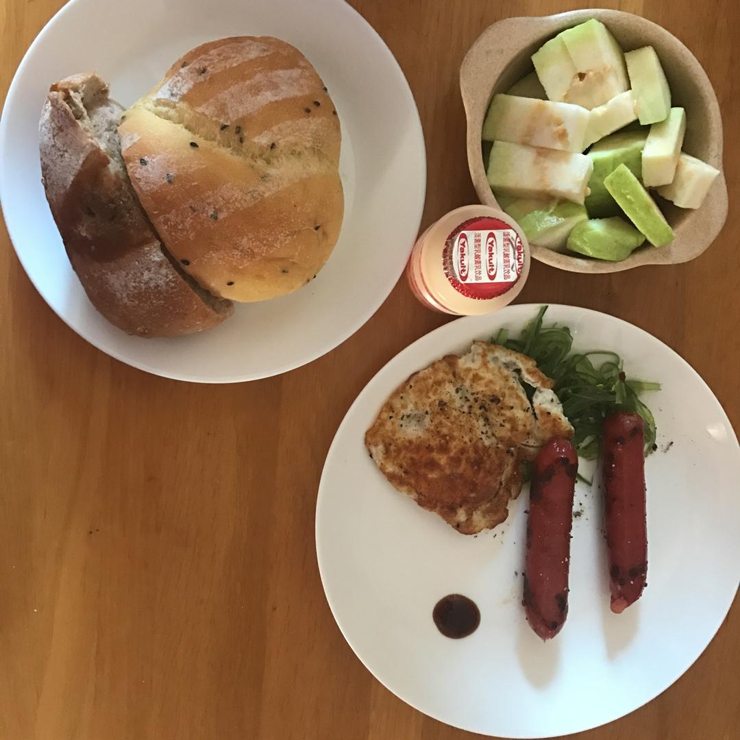 烤香肠+煎蛋+面包+芭乐 上班时间的快手早餐
