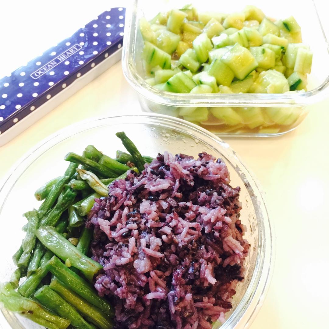 杂粮饭,凉拌黄瓜,清炒四季豆
