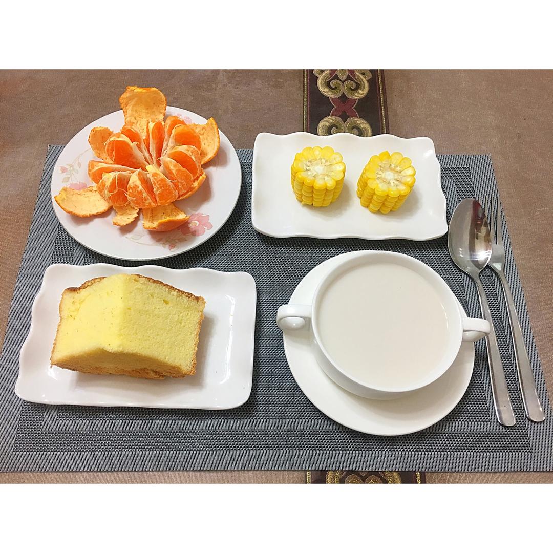 戚风蛋糕+甜玉米+茂谷柑+核桃露。