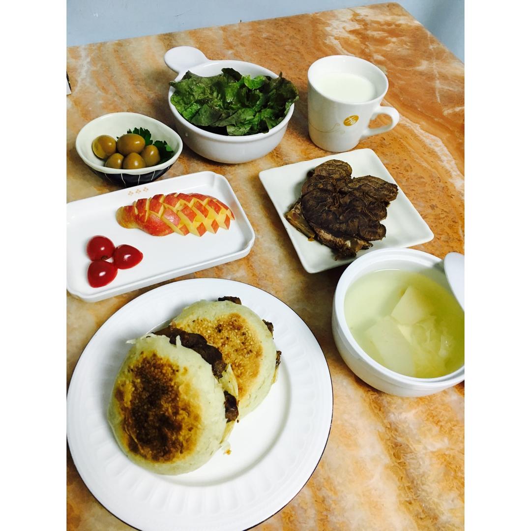 烧饼夹牛肉,酱牛肉,卤蛋,雪梨银耳百合汤,牛奶,水果。