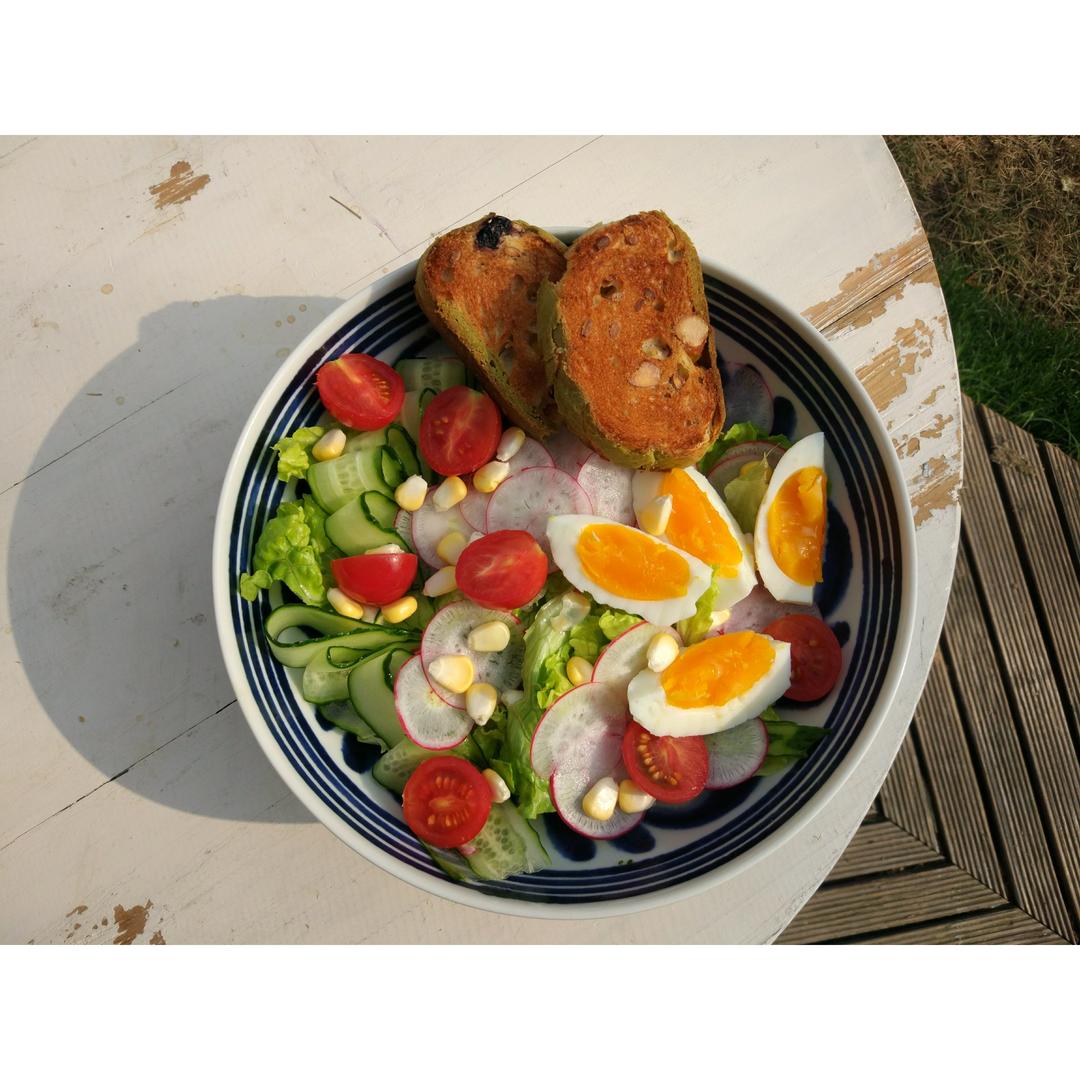 唐小唐妈妈 做过 晚餐•2017年4月12日 #晚餐•2017年4月12日##五年级放学点心#吃草!生菜,黄瓜,甜玉米,千禧番茄,樱桃萝卜,水煮蛋,两片烤过的杂粮干果面包。淋焙煎芝麻酱 2017-04-12