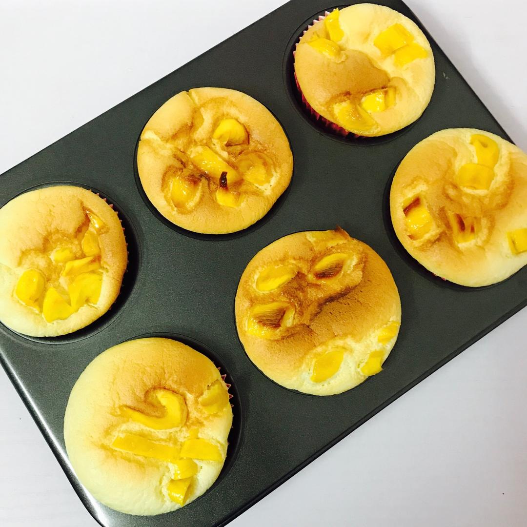 加了芒果干在上面,第一次做里面好松软哦,这配方不错!但是还是会塌下去,什么原因呢?