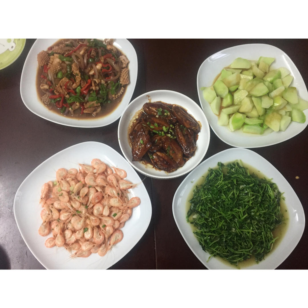周末晚餐-可乐鸡翅、白灼芥兰、酱爆鱿鱼、蒜蓉豆苗、盐水白米虾