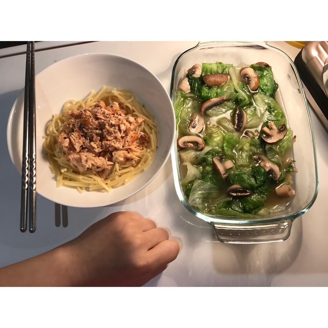 换了一种意面 继续 三文鱼 蘑菇青菜汤 满足