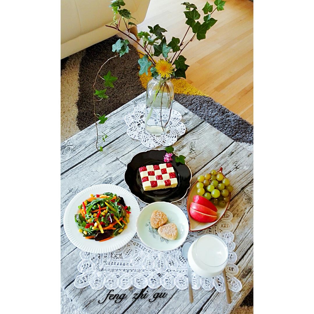 田园蔬菜沙拉+烤鸡块+自制草莓酱棋格蛋糕、水果,牛奶,早安!