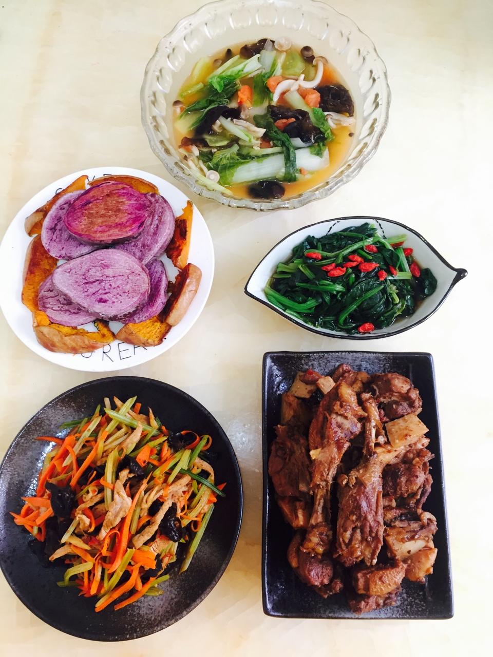 青草0643 做过 芹菜木耳炒肉丝 老妈跟闺蜜旅游去了,周末和粑粑的午餐,这道芹菜炒肉评价不错,主要考虑到最近粑粑血压有点高!芋头啤酒鸭用了🍋和山楂,微酸,烤南瓜和紫薯是我的最爱,面是老爸的最爱,为了做面专门烧了番茄白菜汤,用心的做顿饭感觉真好!😌 #晚餐•2017年4月23日# 2017-04-23