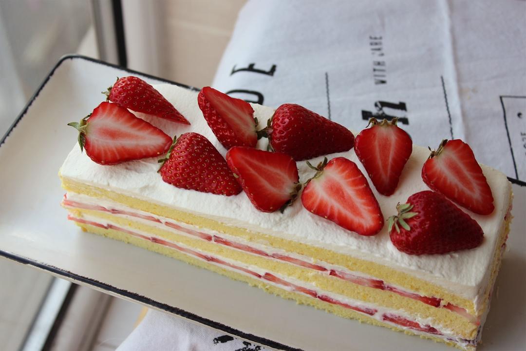烤海绵底的时候完全忘记加水,最后竟也破罐子破摔地抹了奶油摆了草莓。