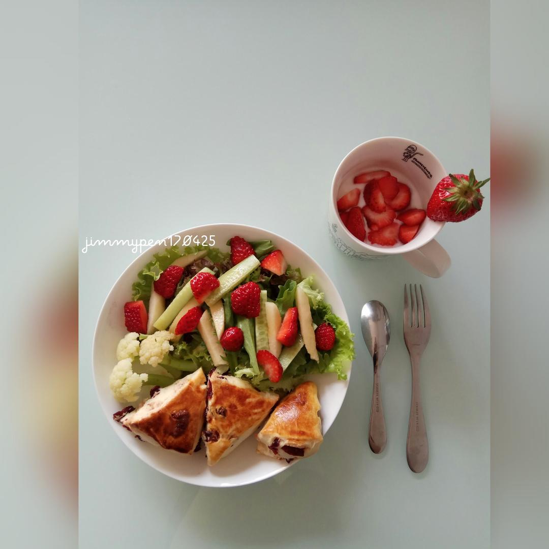 jimmypen 做过 早餐马拉松顺利收官:因为坚持,所以更好! #早餐•2017年4月25日##7天mini马拉松##早餐马拉松#第七天,早安!蔓越莓司康+草莓沙拉佐油醋酱+草莓酸奶,今天是草莓大餐呢! 2017-04-25