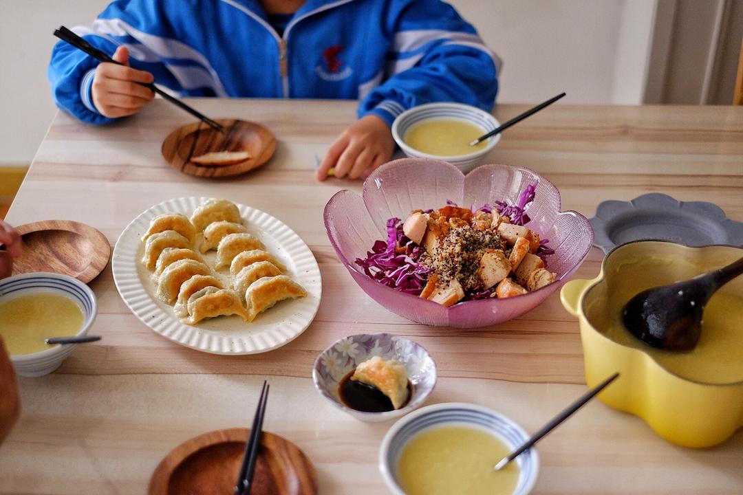 煎饺。鸡胸肉黎麦紫甘蓝沙拉,自己调的经典糖醋汁小米南瓜🎃粥。