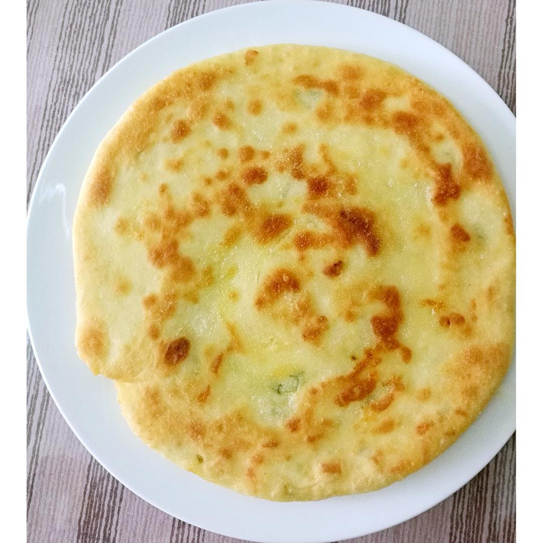 芝士饼做法:面粉、奶粉(约5:1)加少许盐,温水和成刚刚不粘手的柔软面团,醒20分钟以上再揉开,擀成薄的大饼,上撒葱花、芝士、少量盐一薄层白糖,卷起成长桶儿,桶从一边向里再卷成面圈团,按扁,擀成约2、3毫米的饼,锅烧热加一薄层油,中火烙至两面金黄起鼓即可。