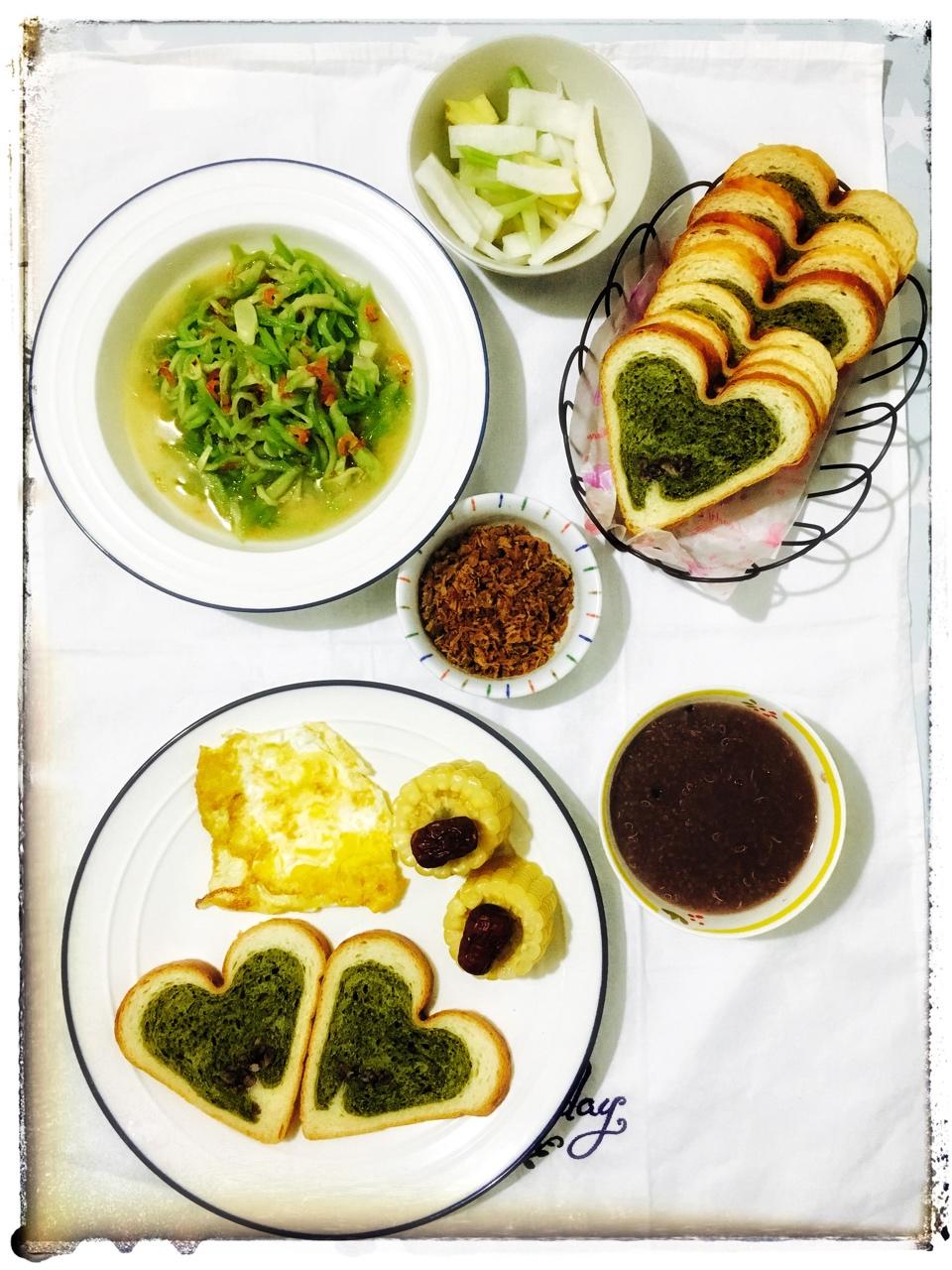 葱和大蒜的厨房 做过 早餐马拉松顺利收官:因为坚持,所以更好! 晚上烤好的抹茶蜜豆心形吐司,还做了肉松,孩子们吃起来停不下,然后就剩下这么一点,😄炒了丝瓜海米,熬的藜麦薏米粥,还有晚上冷藏的萝卜泡菜。周末愉快✌️ #早餐•2017年4月28日##早餐小食代##甜蜜烘焙# 2017-04-28