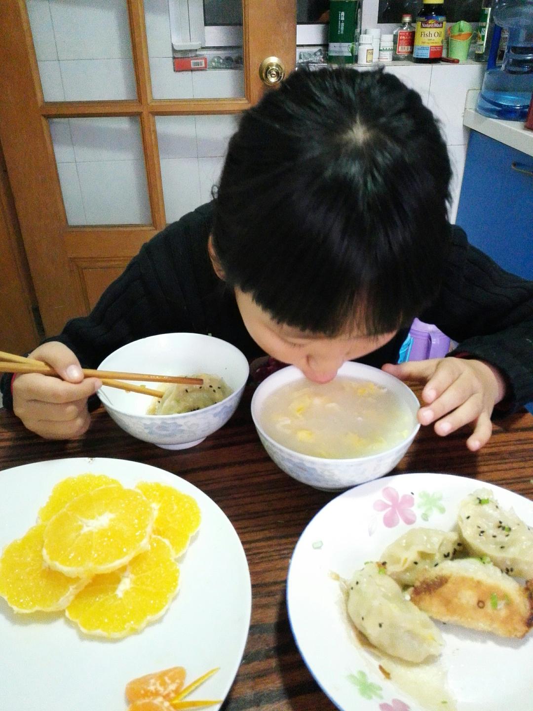 煎饺,橙子,鸡蛋汤