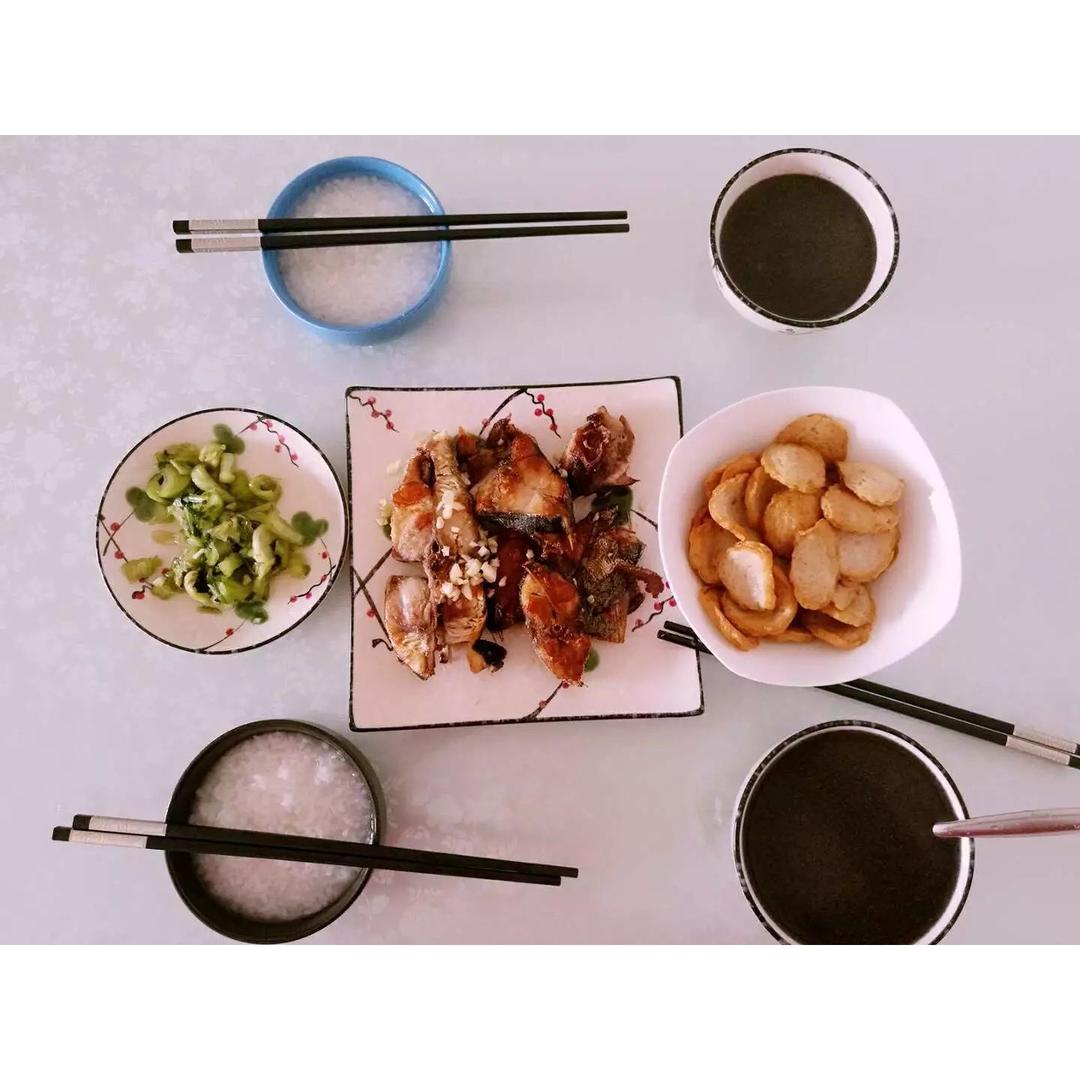 煎鱼+肉卷片+咸菜+白粥+芝麻糊