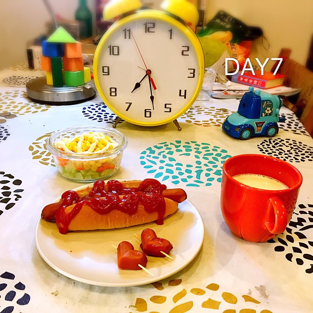 DAY7️⃣:美好的假期模式开启,热狗(哦,番茄酱太多了)+玉米萨拉当然还有牛奶