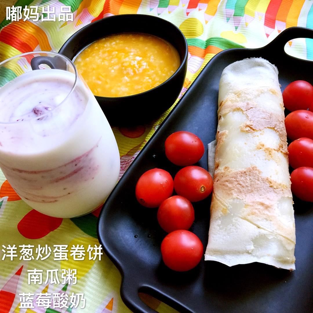 明净的厨房 做过 早餐•2017年4月29日 洋葱炒蛋卷饼、南瓜粥、蓝莓酸奶。为预防假期卡路里超标,摊饼不放油,洋葱炒蛋也少油,省下热量指标中餐晚餐放肆吃喝😄! #早餐•2017年4月29日##摊饼##中式面点# 2017-04-29