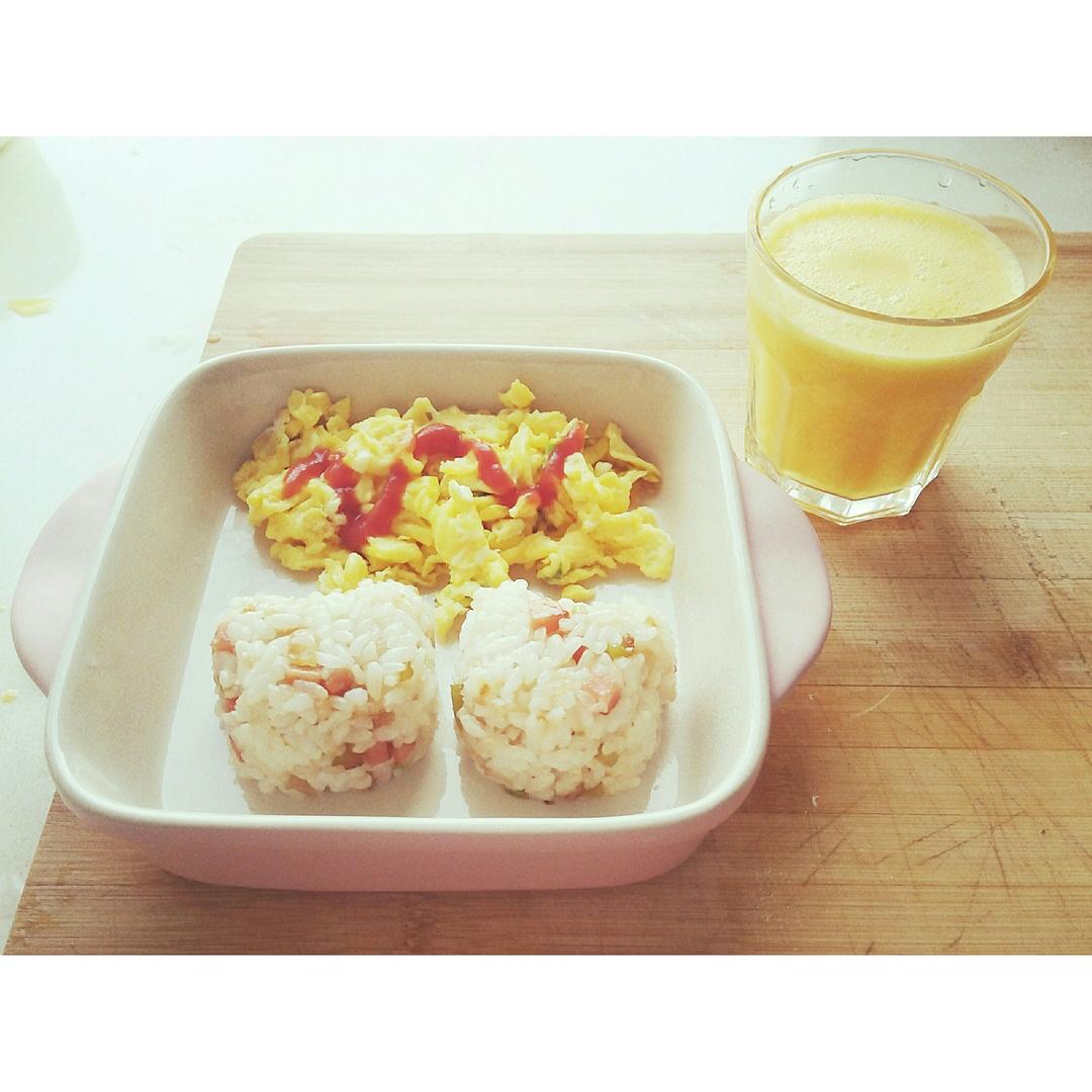 火腿炒饭~葱香鸡蛋~橙汁