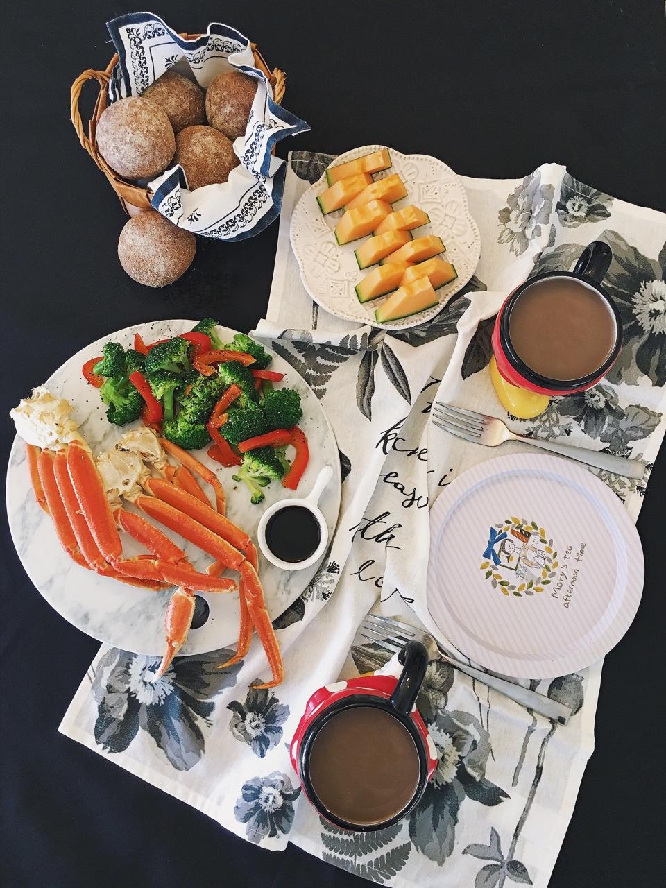 雪蟹腿 清炒甜椒西兰花 自制全麦奇亚籽餐包 热可可 蜜瓜
