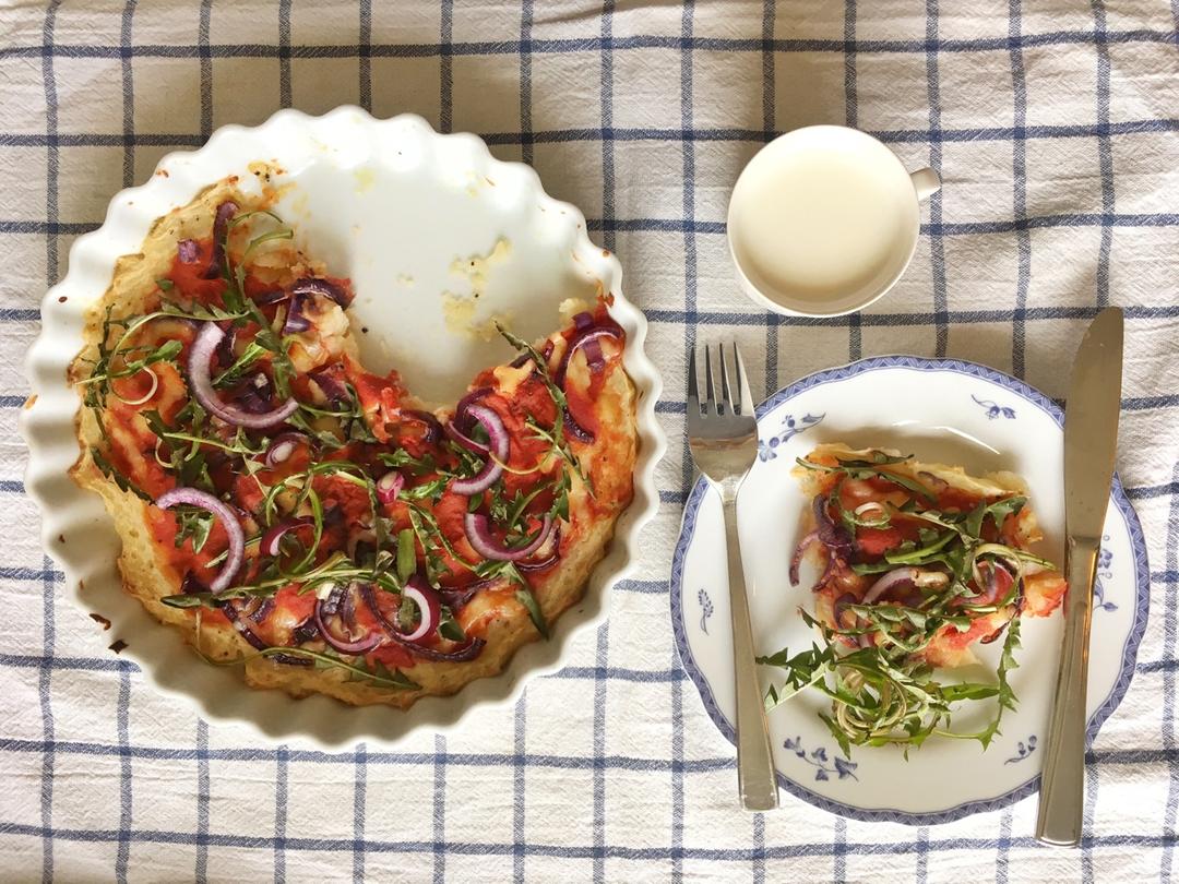 找草吃 做过 早餐马拉松顺利收官:因为坚持,所以更好! 难得善待自己的周六 做了土豆底披萨 配昨晚摘回来的蒲公英没放一滴油 上面用的低脂cheese 热量低到爆表😂整盘不到700卡而且竟然不比外面做的味道差 感觉又开启了一个省钱之门 #早餐•2017年5月6日# 2017-05-07