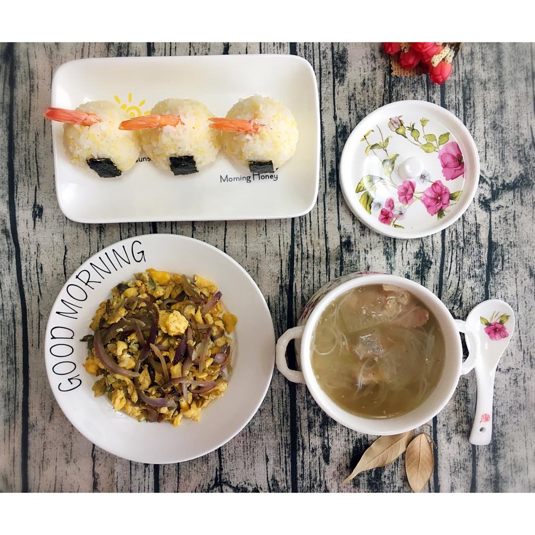 鲜虾饭团+洋葱炒蛋+冬瓜排骨汤
