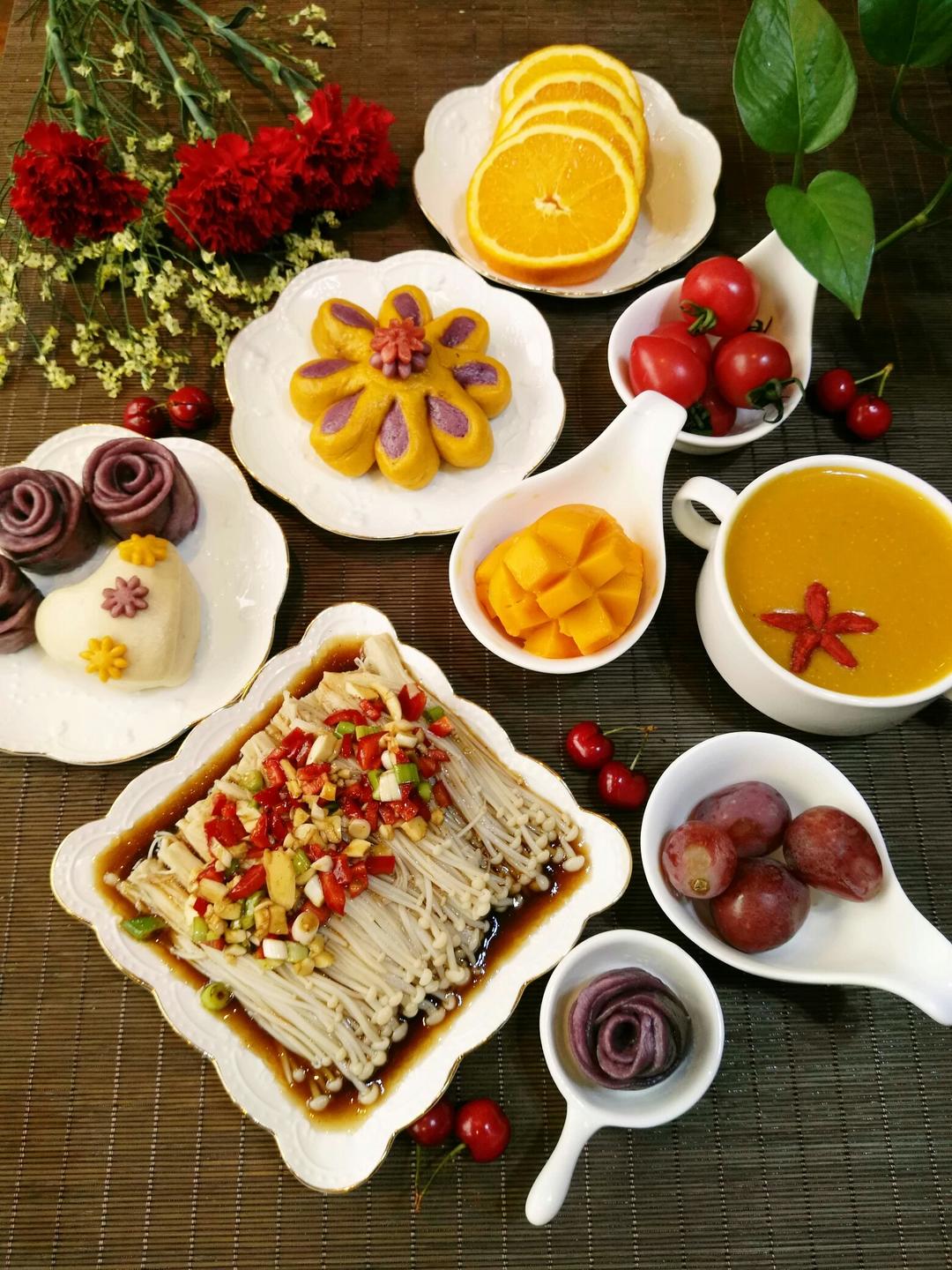 花朵馒头,南瓜粥,凉拌金针菇,水果,今天母亲节,祝全天下母亲节日快乐。