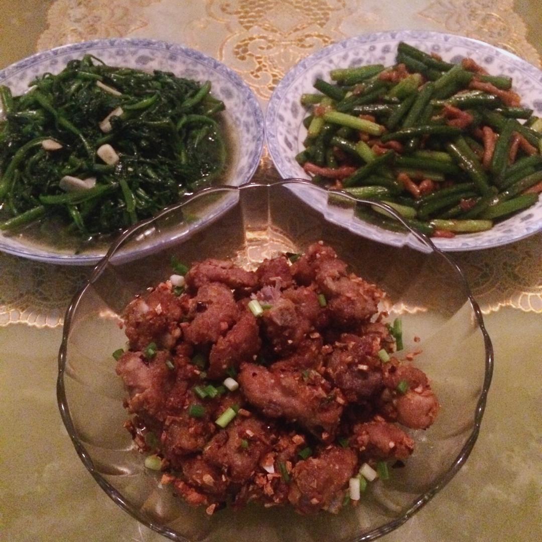 黑暗料理夫妇 做过 晚餐•2017年5月14日 2017年5月14日。清炒空心菜,蒜苗炒肉,蒜香排骨。ps:空心菜不要炒太久,蒜苗和肉分开炒,最后再混在一起,腌排骨不要放胡椒,不要放胡椒,不要放胡椒! #晚餐•2017年5月14日# 2017-05-14